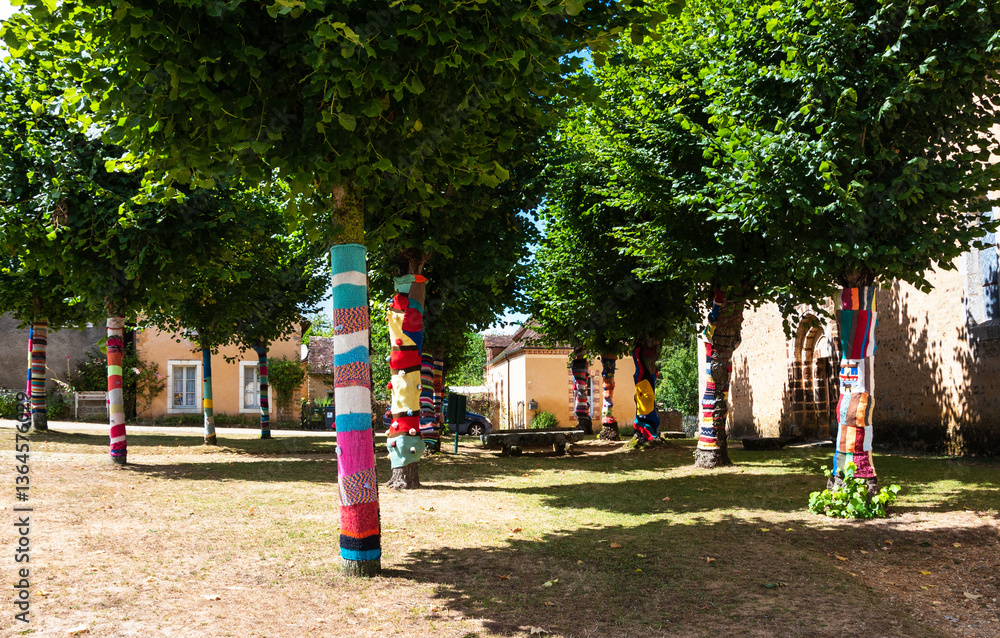 Trees dressed in knitted colorful wool "clothes" near the entry to old church famous for its remarkable medieval frescoes in Asnières-sur-Vègre one of the most beautiful villages in France.