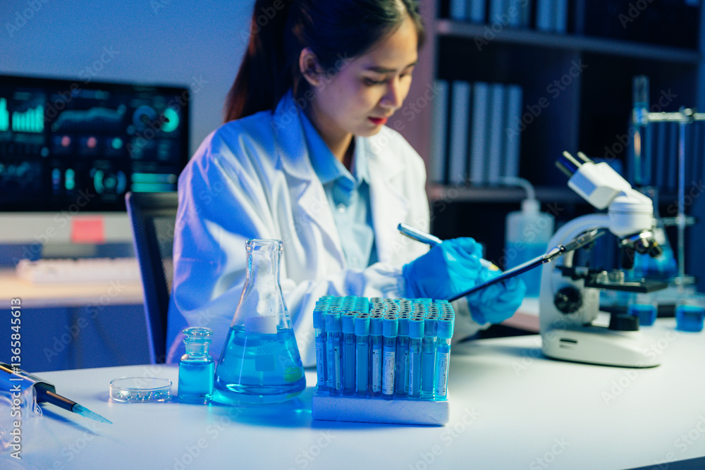 Scientist taking notes on clipboard working with test tubes and microscope in laboratory