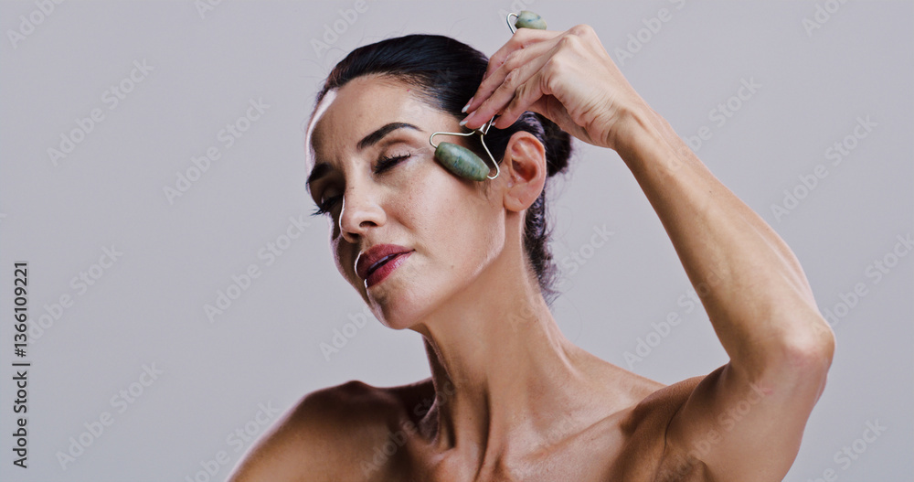 Beauty, facial and jade roller with woman in studio for antiaging cosmetics or dermatology. Gua sha, massage tool and skincare with person isolated on gray background for crystal stone face treatment
