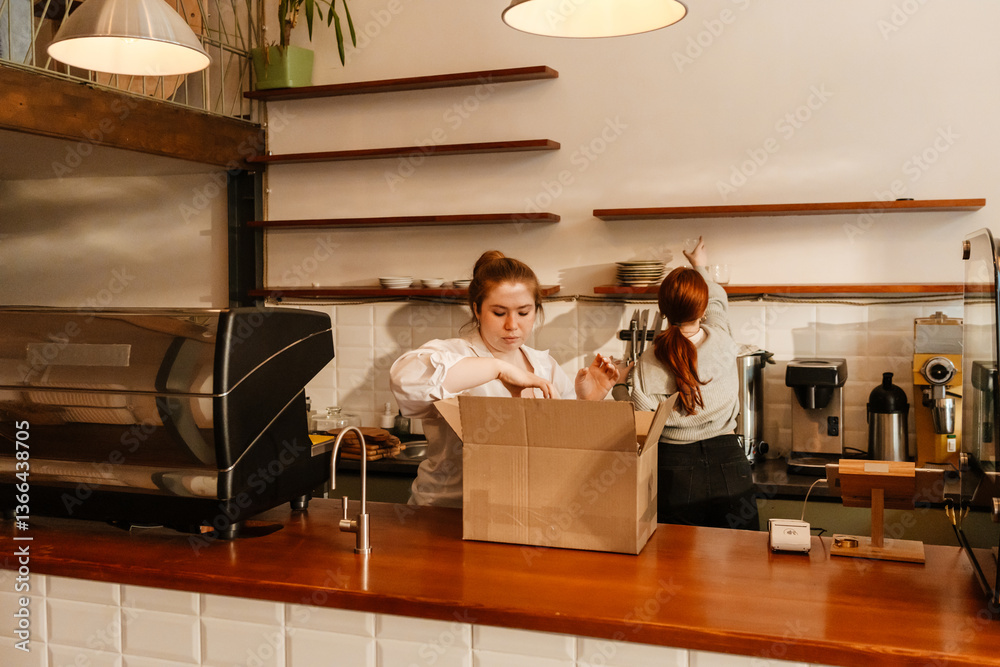 A White female cafe owner and a White female worker with red hair organizing and unpacking supplies for their cafe renovation, preparing for the grand opening of their new cafe business.