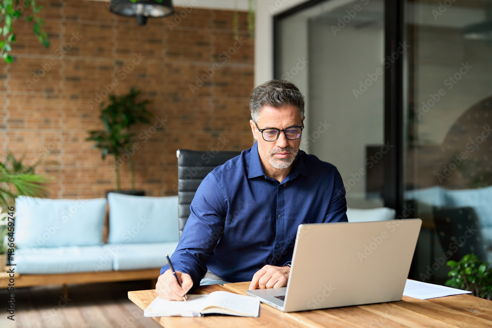 Senior business man company manager working on computer elearning webinar sitting at office desk. Busy mature middle aged professional businessman executive using laptop at work writing notes.