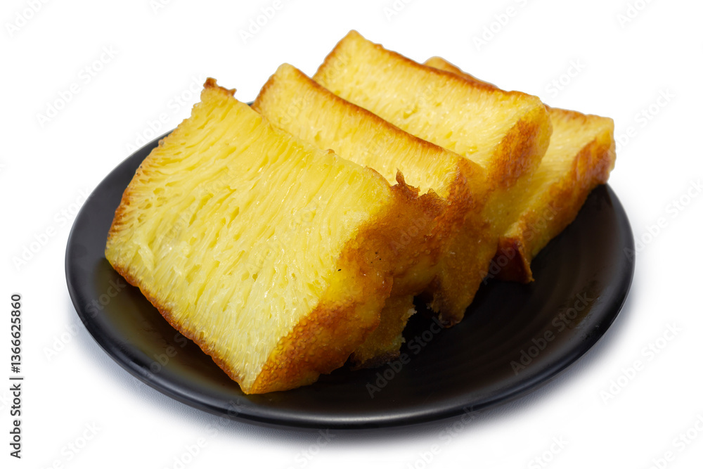 Four slices of golden yellow Bika Ambon cake served on a round black plate. This traditional Indonesian cake features a distinctive honeycomb texture and a sweet, rich flavor.
