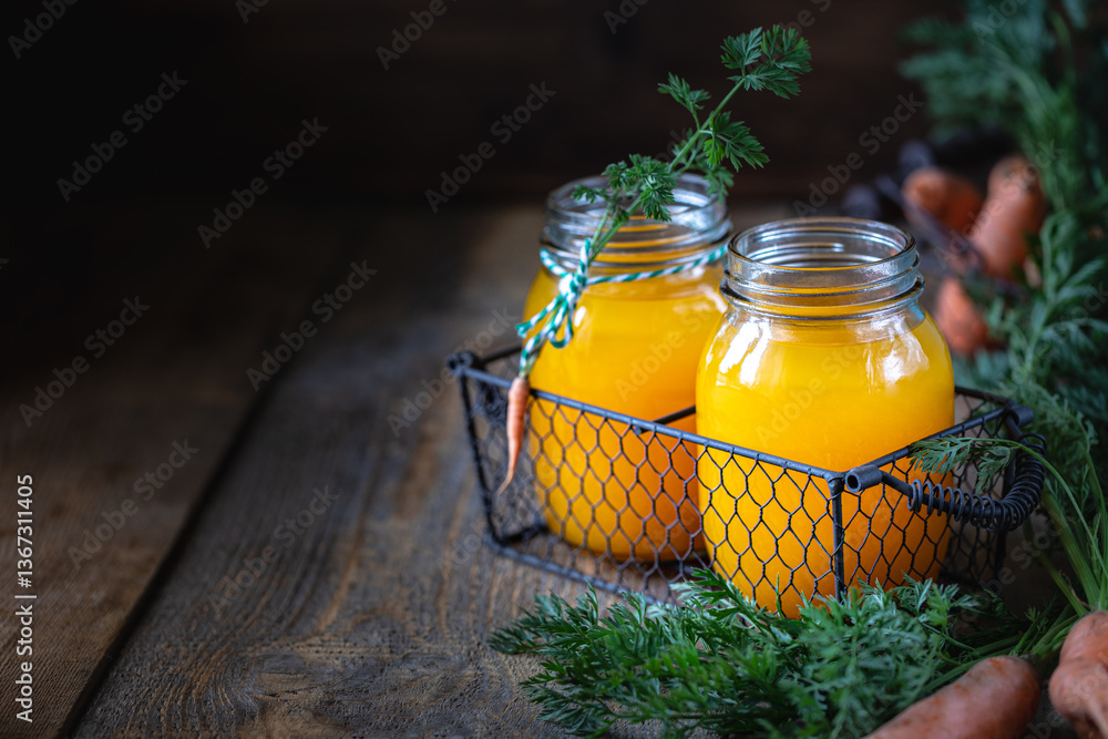 Healthy food. Carrots and carrot juice in a glass jar in a metal basket on a dark wooden background