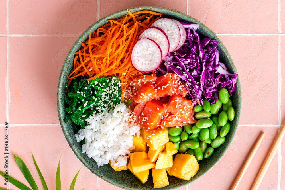 Poke bowls for balanced diet with vegetables, legumes, seafood and rice on pink background