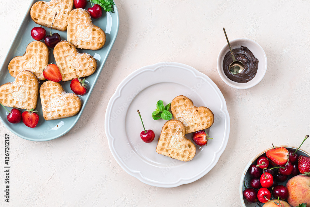 Heart shape waffles with assorted berries mix, strawberry, blueberry, decorated with mint leaf.