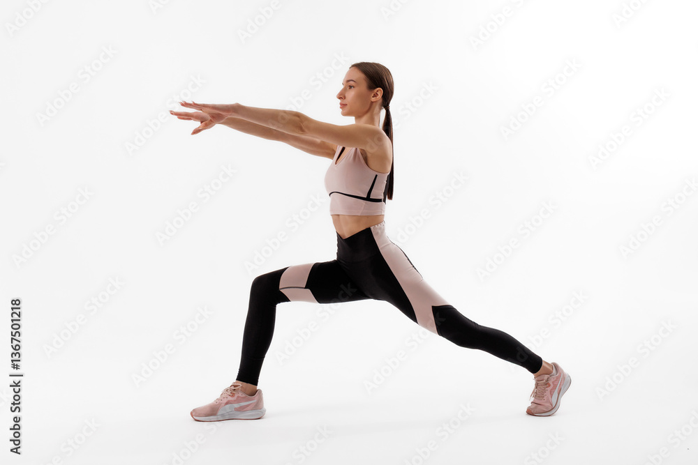 Female athlete performing a lunge exercise in modern activewear on a clean white background