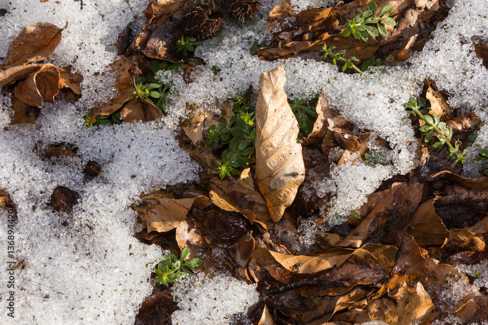 Frühling, Schnee, Blätter, Laub, Eiskristalle,Schneeschmelze,
