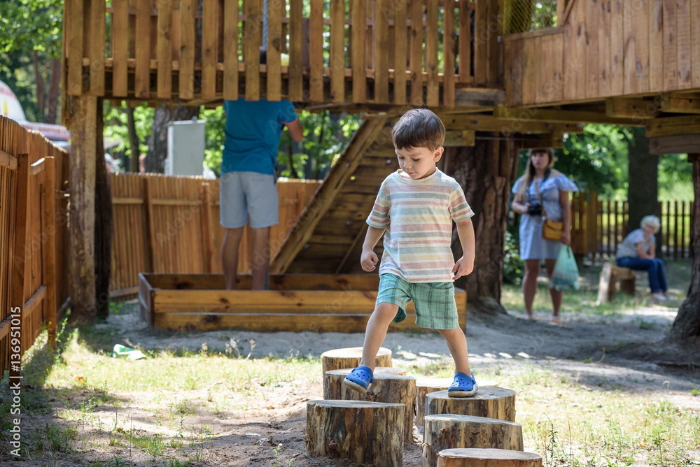 Little boy climbing on a wooden playground in rope park. Kid play outdoors warm sunny summer day