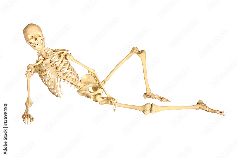 full human skeleton reclined, isolation on white background