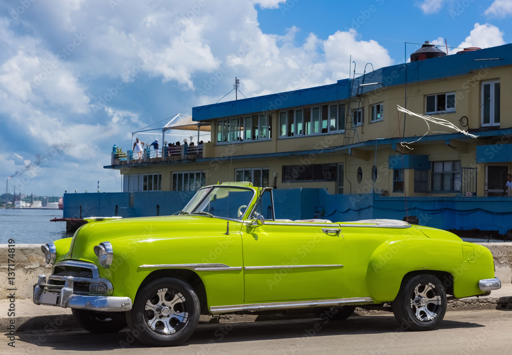 Gelber amerikanischer Chevrolet Cabriolet Oldtimer parkt auf dem Malecon in havanna Kuba - Serie Kuba 2016 Reportage