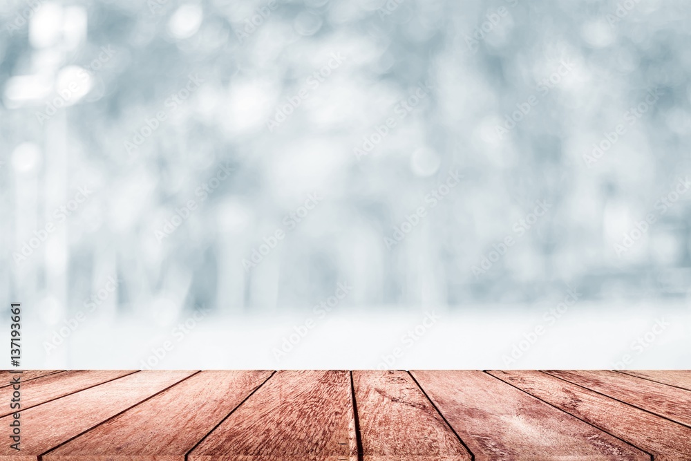 empty wooden on white blurred nature backdrop. Wood table top. can used for display or montage your products
