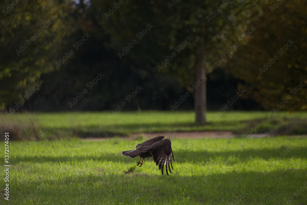 Buzzard takes off, buzzard starts to fly, buzzard taking off, bird of prey takes off, bird of prey on the meadow with open wings, green meadow and trees in the background