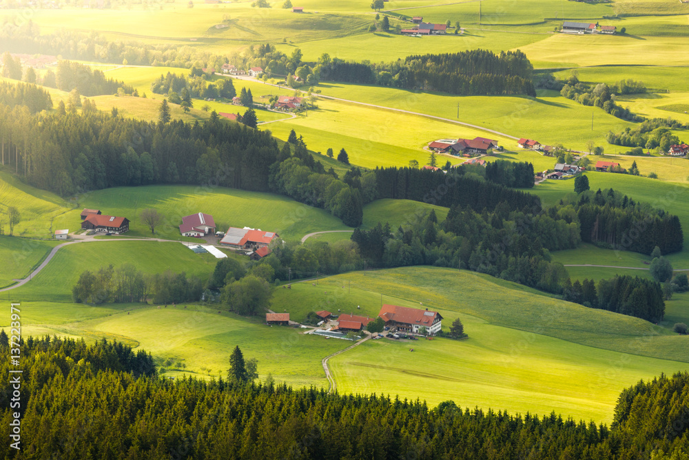 Lovely rural countryside in beautiful sunlight. Pasture landscape with barnyards.