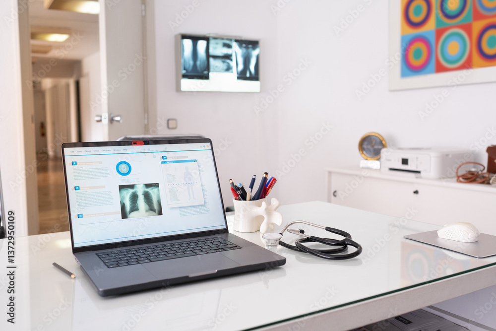 A doctor's consultation desktop. You can see the screen of the p c laptop with a Lungs chest x-ray in the foreground next to a stethoscope. In the background a viewing box with some x-rays