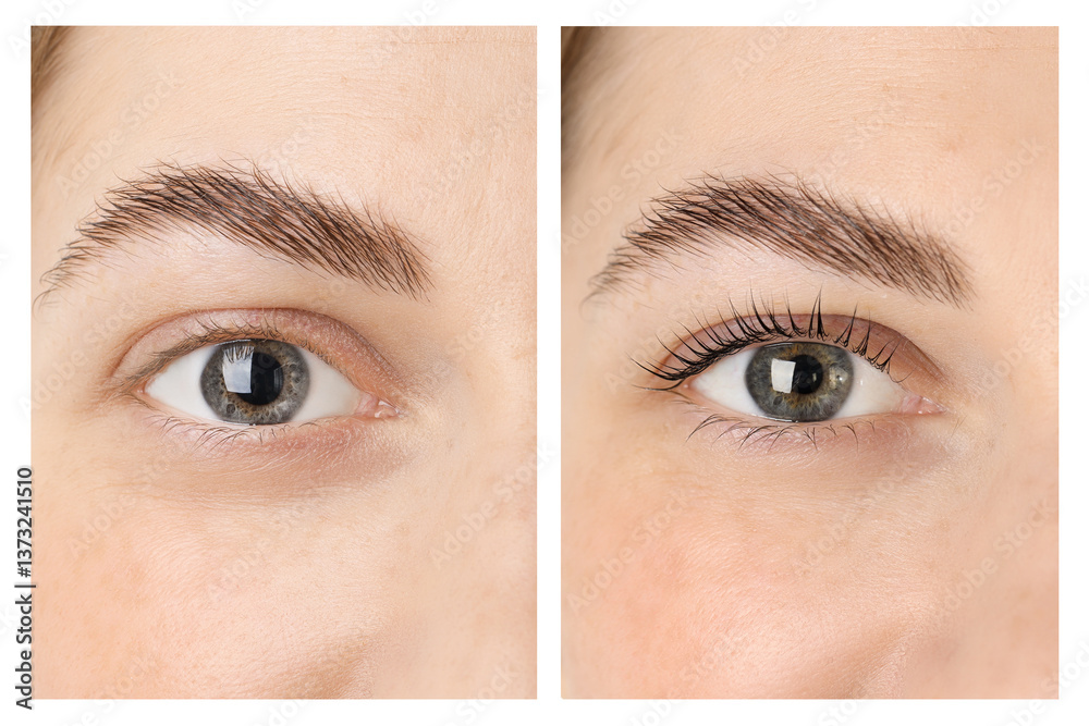 Woman showing her eyelashes before and after lamination procedure, closeup. Collage of photos