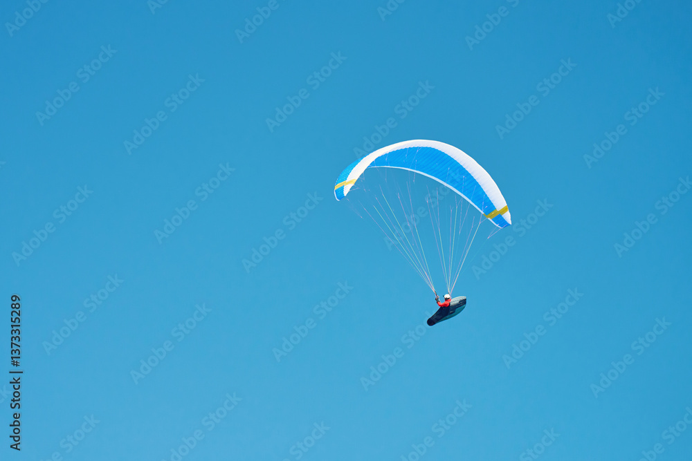 Person is flying on paraglider against clear sky. Paraglide with blue canopy. Extremal sport
