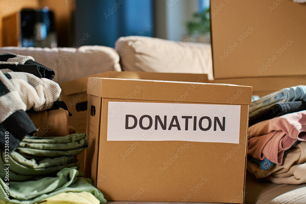Donation boxes in living room. Packed cardboard boxes full of clothes and toys on couch. Concept of charity, social care and volunteering
