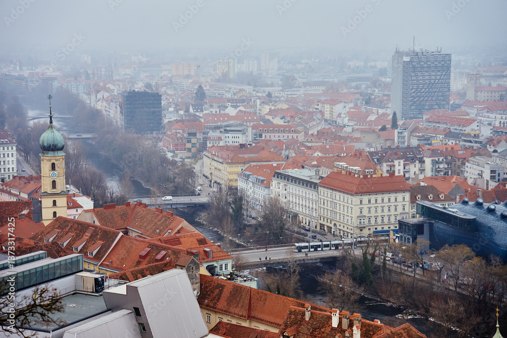 Graz cityscape on foggy day. Panoramic view of Graz, Austria with historical architecture. Streets with red roofed buildings in European city