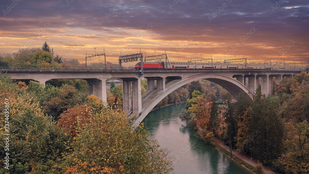 Scenic railway bridge in Switzerland with a red train crossing over a river at sunset surrounded by autumn trees and dramatic sky in Bern. Golden hour