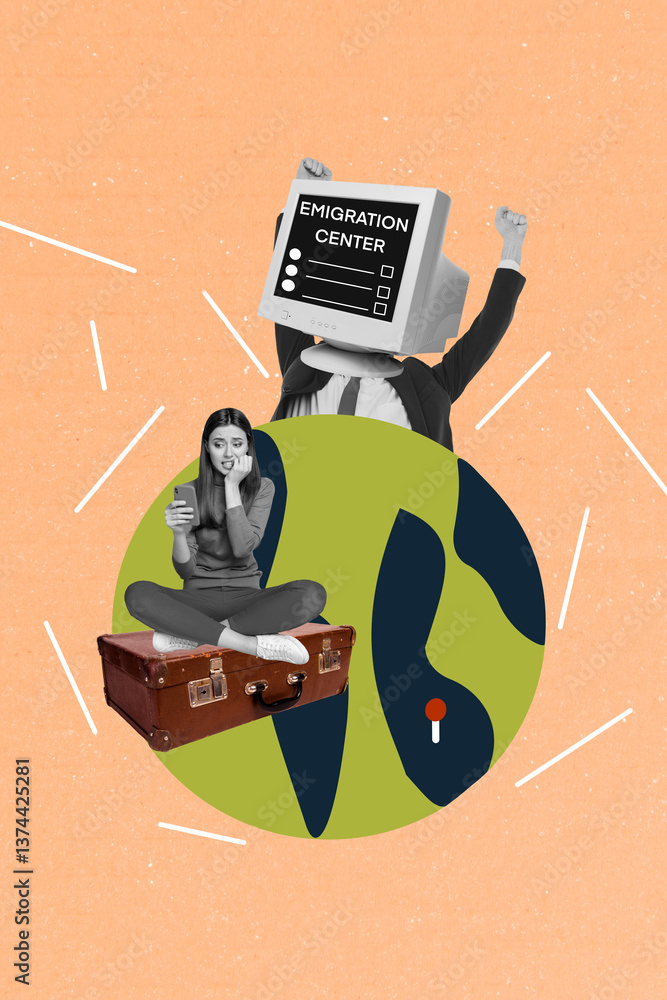 Exclusive image vertical collage of puzzled girl hold phone booking travel sit suitcase earth emigration center instead head pc monitor