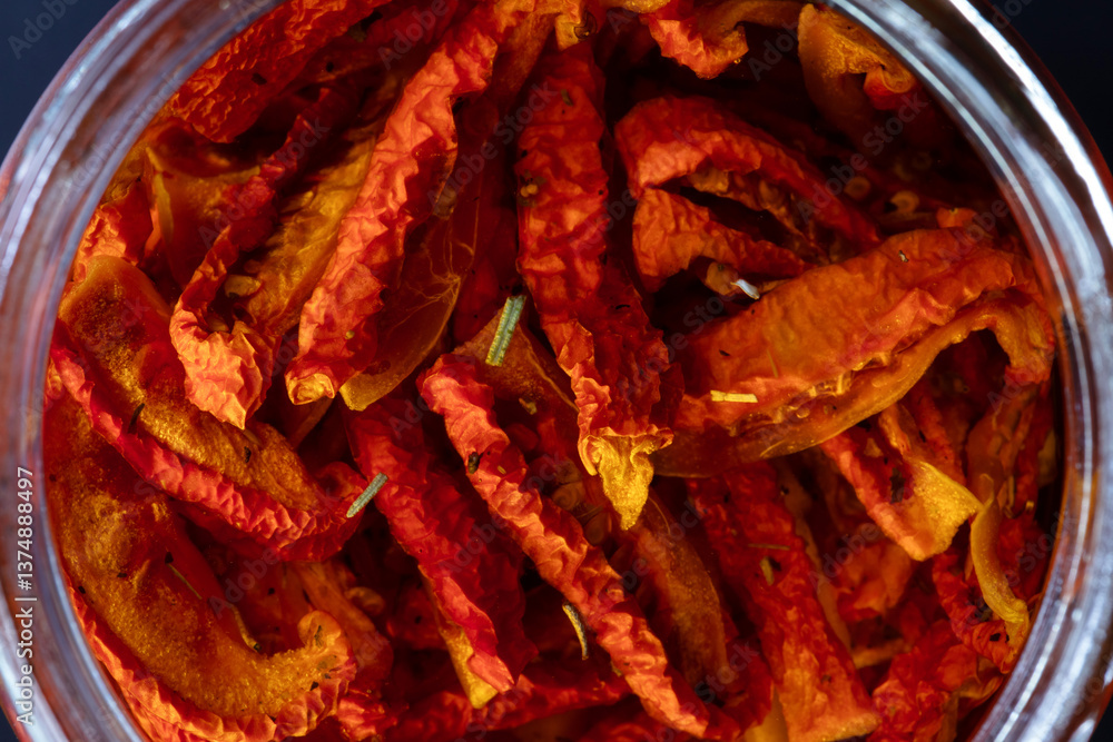 Sun dried chopped tomatoes in olive oil in a glass jar. Shallow depth of field