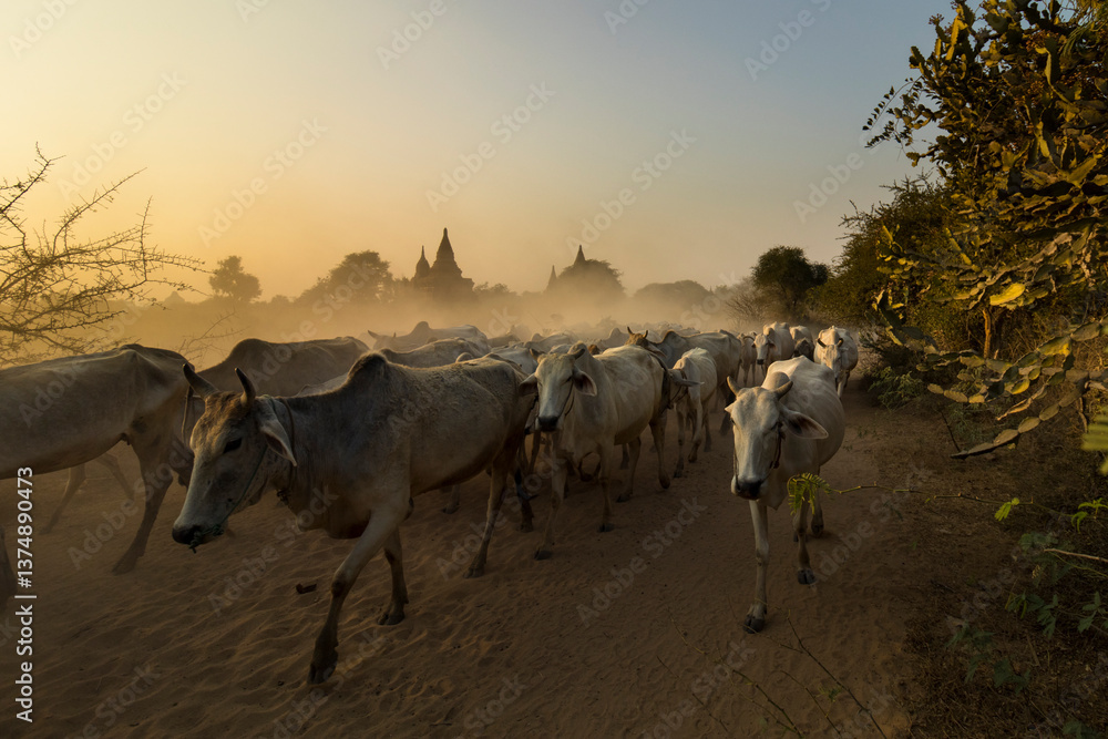 way of life, many cows are going to home in the evening,, Nyaungu city, Myanmar