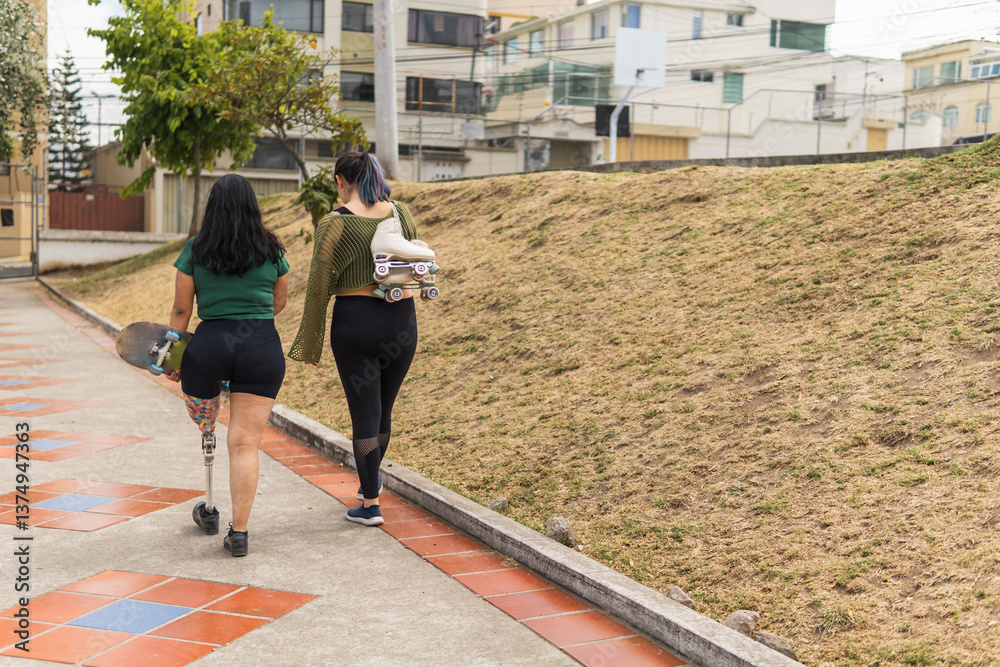 Two young latin american women walking in the park carrying skateboard and roller skates