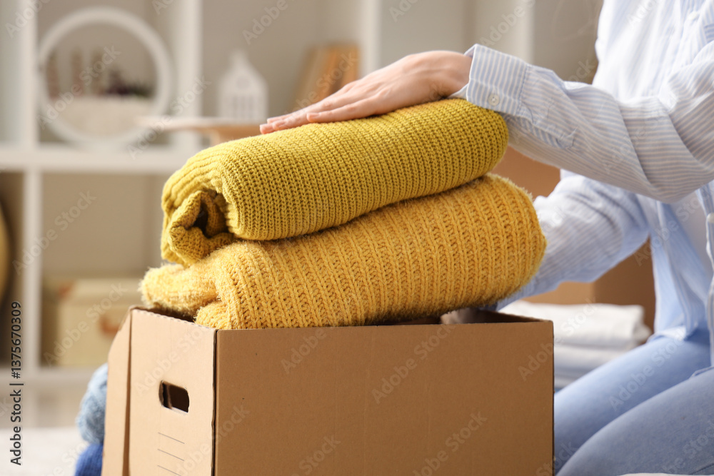 Young woman packing stack of clothes into cardboard box in bedroom, closeup