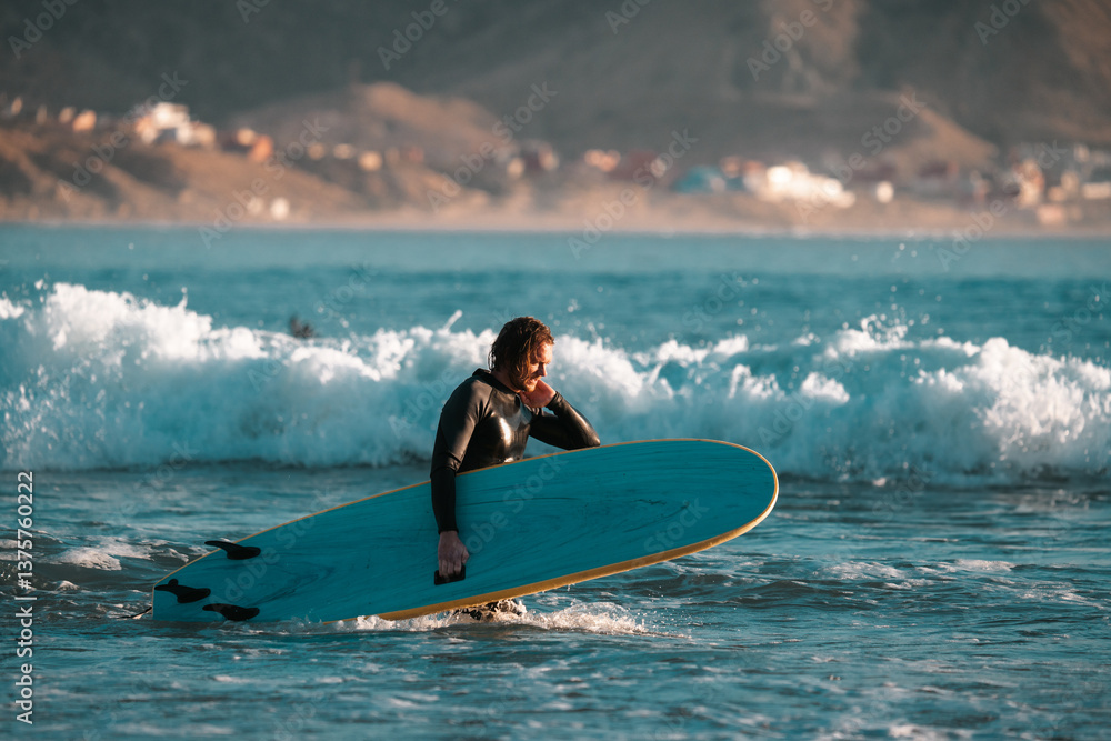 Surfer carrying a surfboard on a beach, summer sunset surf scene