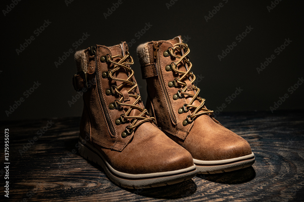 Brown women's leather boots with high lacing on a dark wood floor. Demi seasonal boots with zipper locks.