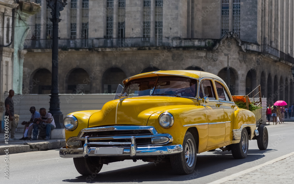 Amerikanischer gelber Oldtimer fährt auf der Hauptstraße durch Havanna Kuba - Serie Kuba Reportage