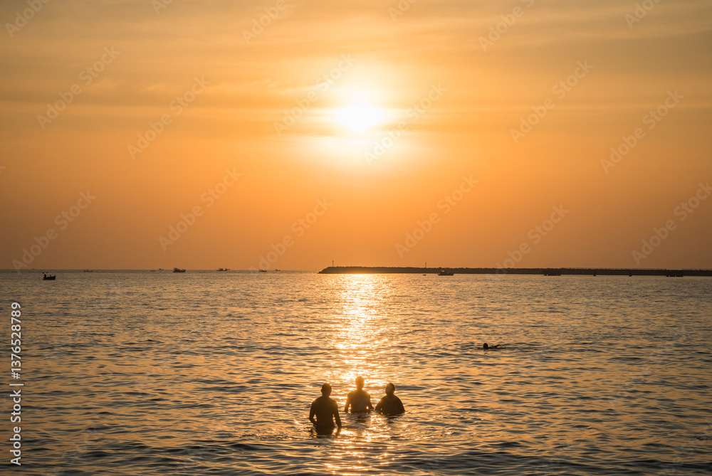 A Beautiful Serene Sunset Over the Calm Sea with Boats Sail Gently Across the Waters Surface, Phu Quoc, Vietnam