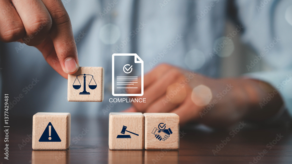 Compliance in business concept.Concept of compliance with icons on wooden cubes. Laws concept. Enforce laws, regulations and standards, comply with business policies.