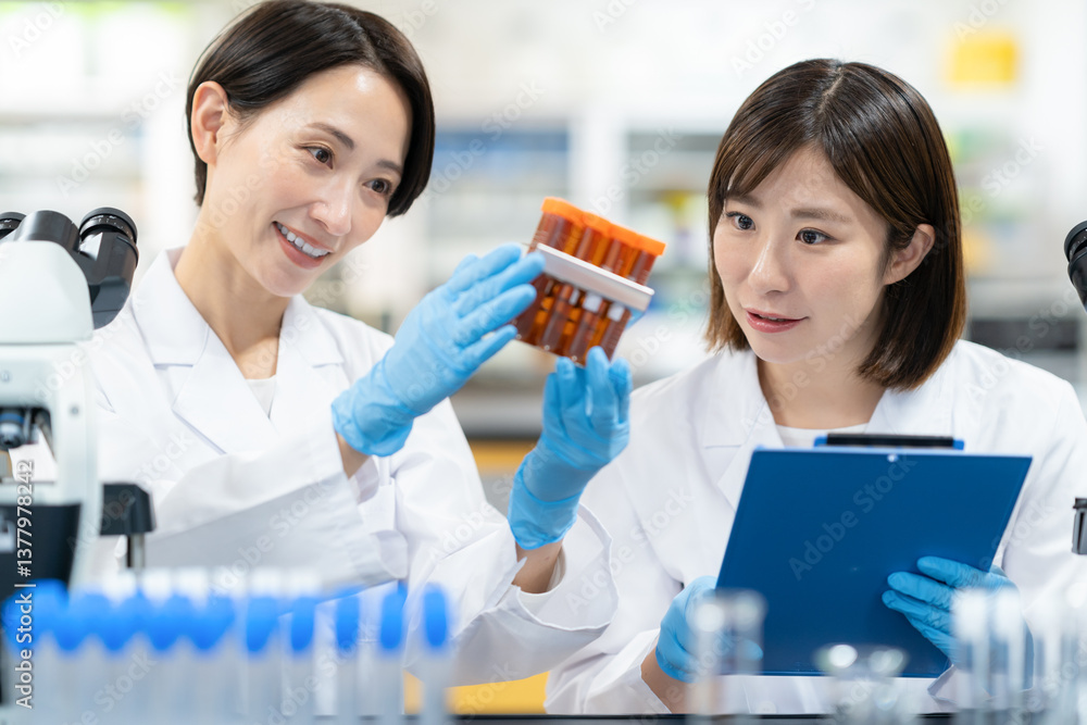 研究室で実験をする女性研究者 撮影協力 学校法人電波学園 東京電子専門学校