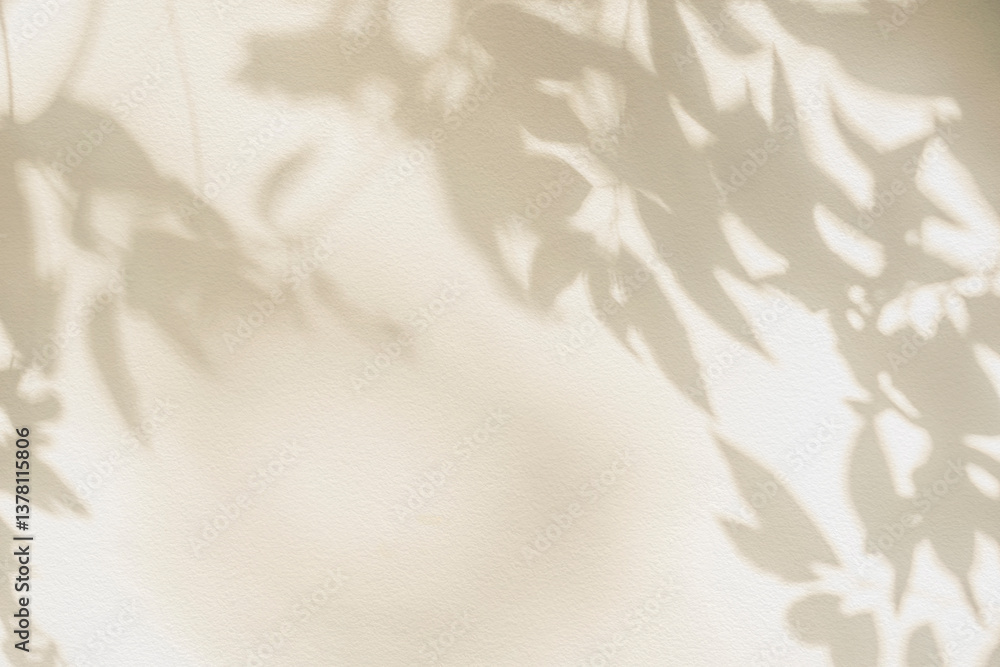 Leaf shadow and light on wall beige background. Nature tropical gray leaves plant and tree branch shade with sunlight on wall texture for background wallpaper and design, shadow overlay effect