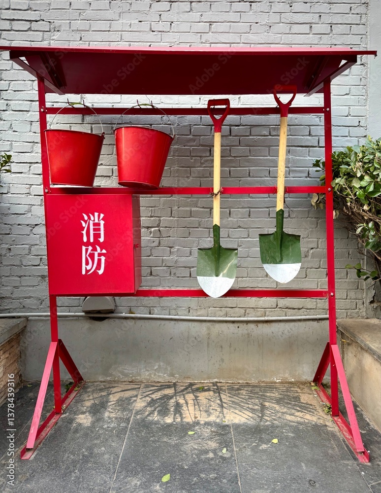 Stand with for fire fighting equipment in China. Sign in Chinese means ''Fire Control'' or ''Fire Fighting''.