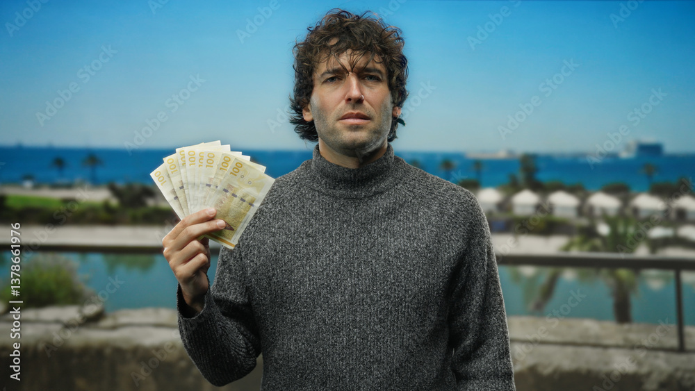 Man holding norwegian banknotes on a seaside beach with blue sky and palm trees background.