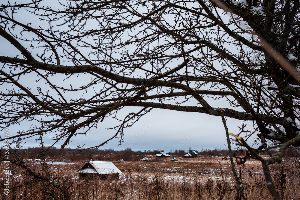 Winter landscape of a village, tree branches in the foreground, wooden houses hanging out.