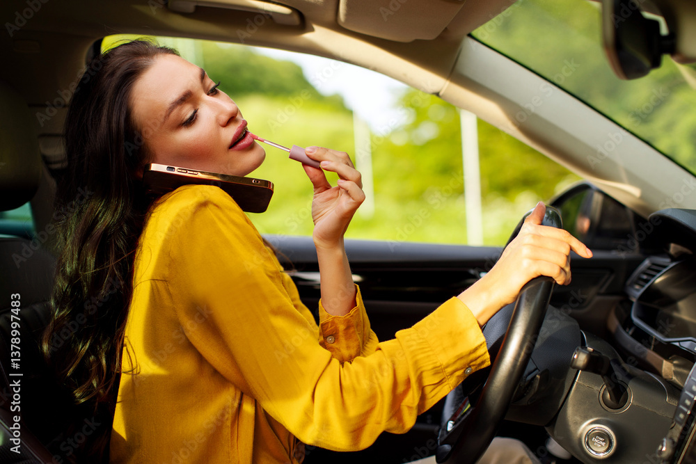 Woman driver multitasking, talking on cellphone and applying lipstick, while holding steering wheel, view from inside, side view