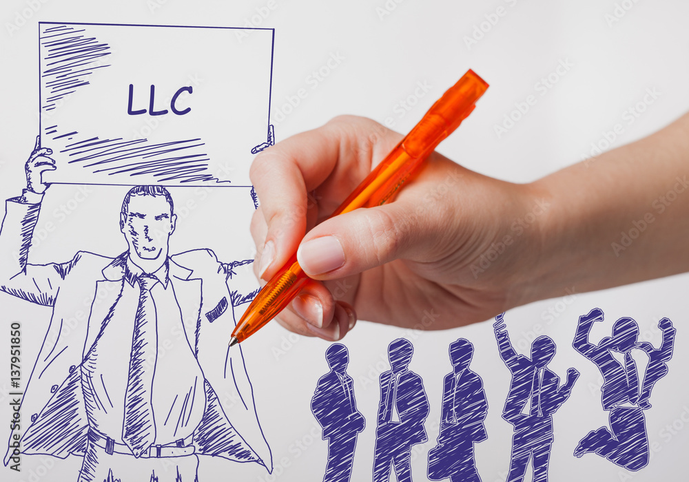 Business, technology, internet and networking concept. The girl draws a pen businessman with a poster in his hands. The sign reads: LLC