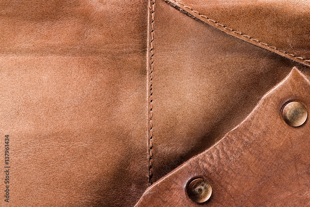 Closeup image of brown old leather texture patchwork with rivets as natural background.