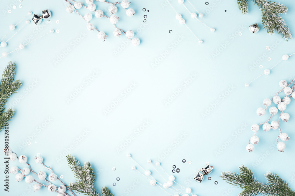 Christmas composition with fir branches and decorations on blue background. Flat lay, New Year frame.
