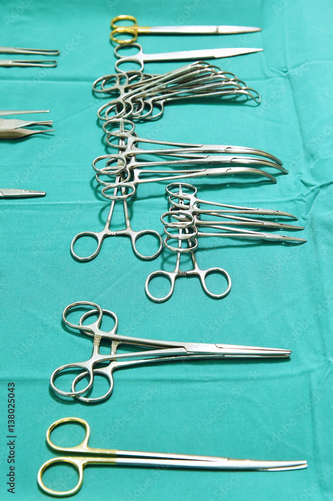 Detail shot of steralized surgery instruments with a hand grabbing a tool
