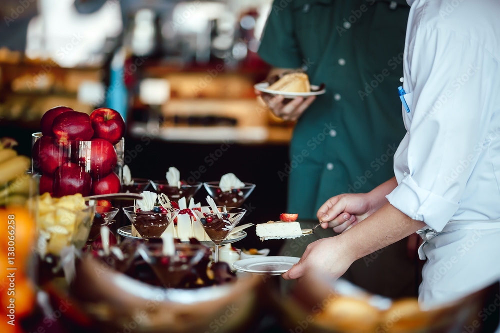 Chef treats guest cheesecake buffet closeup hands