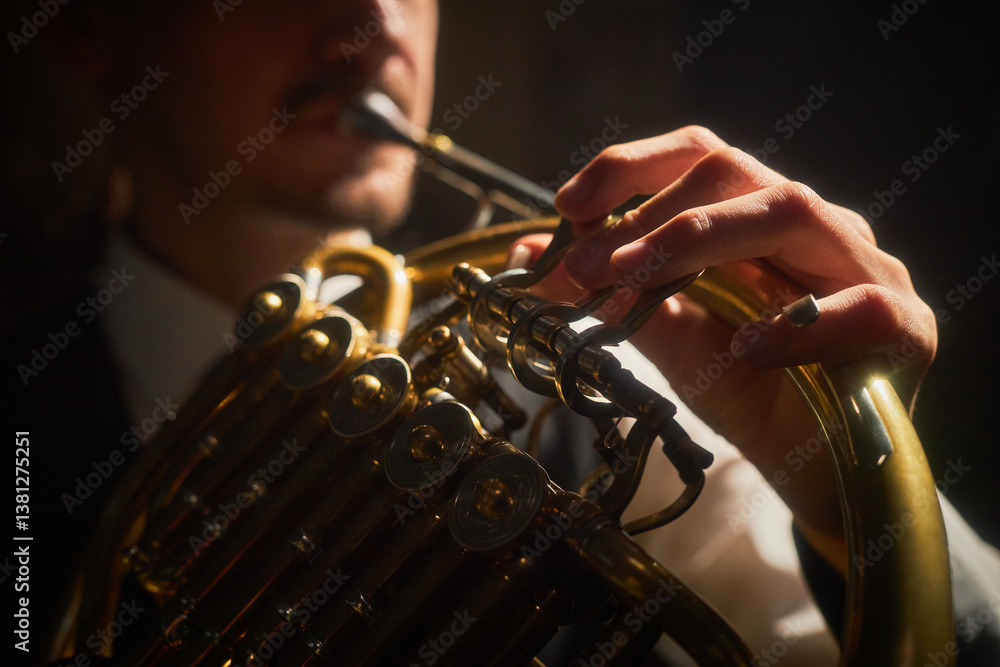 Close up on nimble fingers of male musician playing French horn pushing valve levers while performing music on stage in contrast lighting