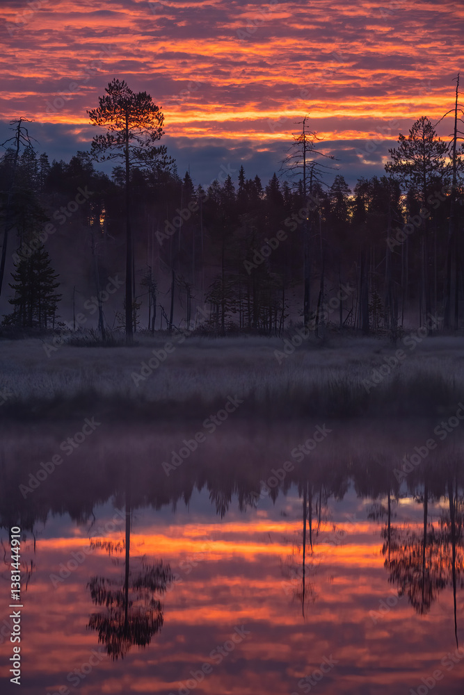 Finland Landscape. Silhouettes of Pines at Twilight. Wetland Forest with Reflected Sky. The burning sky mirrored in calm water evokes a magical twilight stillness.