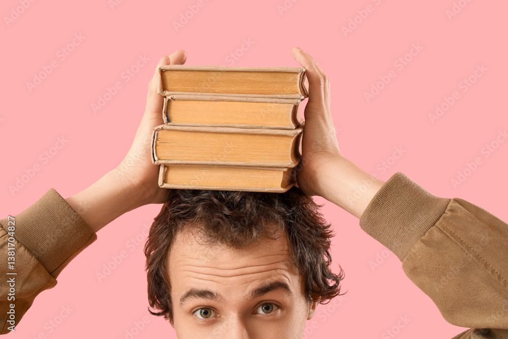 Young man with stack of books on pink background, closeup