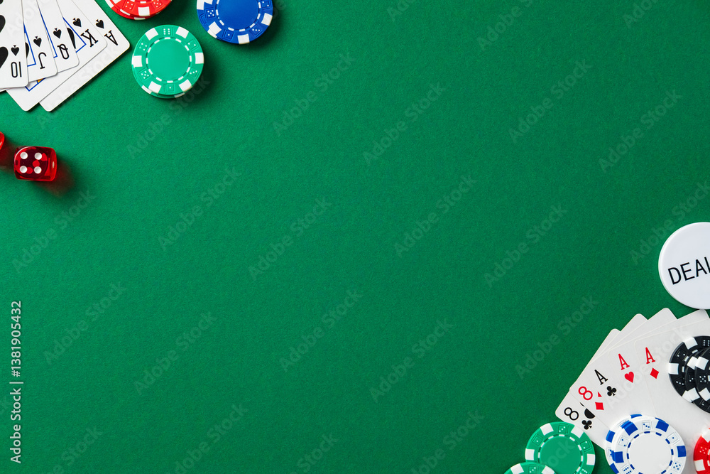 Green poker table flat lay with cards, chips, dice, and dealer button. Gambling or casino background concept with empty center copy space.