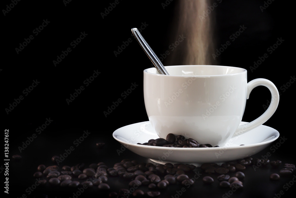 Hot cup of coffee in white on a dark background.