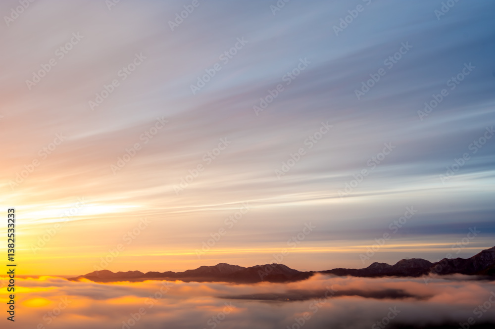 雄大な朝の空。下に広がる雲と山並みのシルエット。